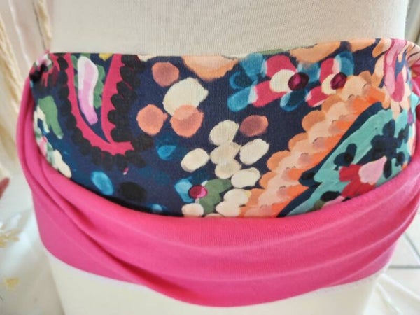 Ceinture en jersey coloris fuschia, brodé. Ceintures bouillottes coloris framboise. Coloris poche: bombay.