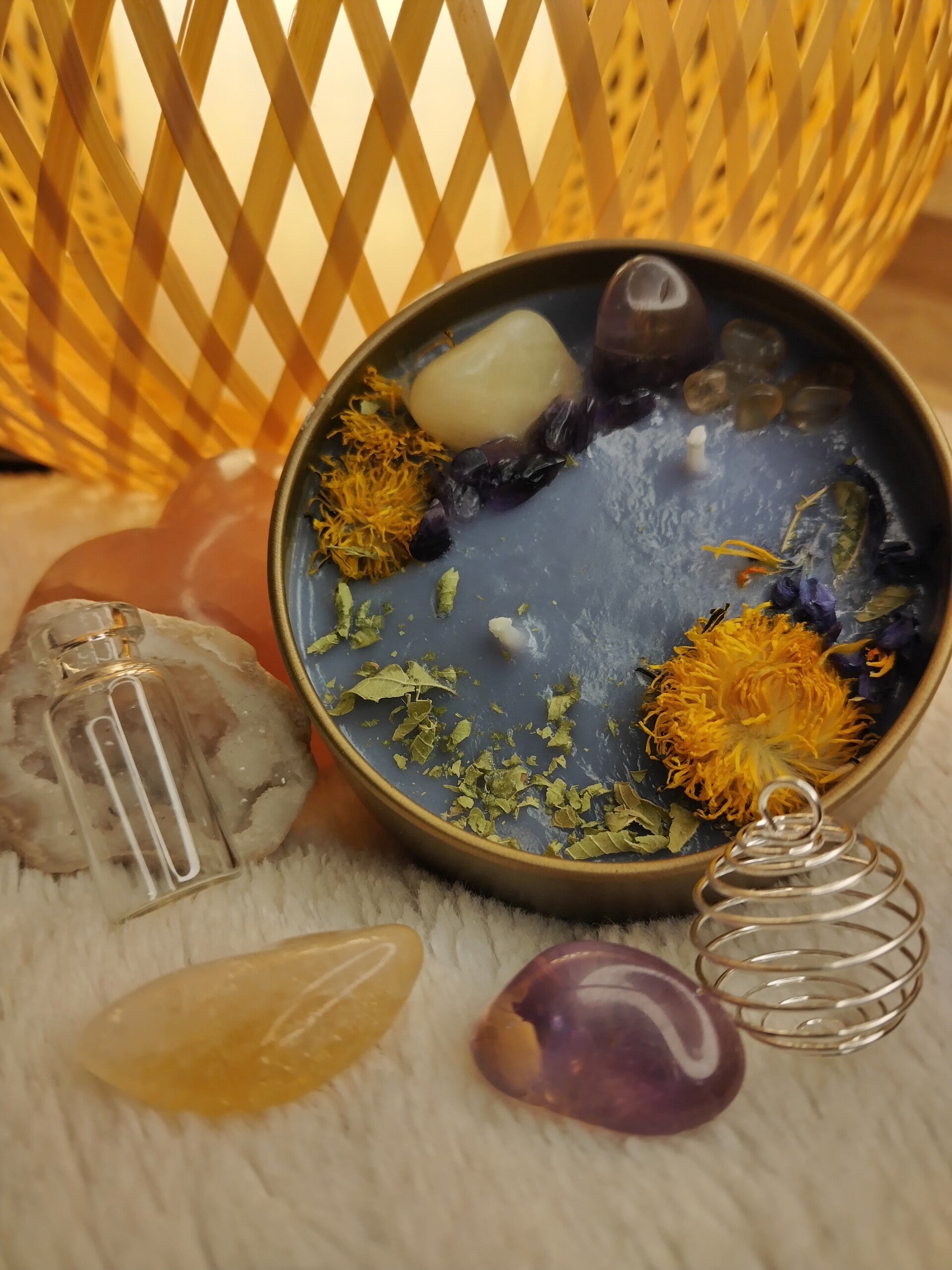 Bougie énergétique pour apaiser les émotions, le stress dû aux douleur d'endométriose. Réalisée artisanalement dans notre atelier en Vendée